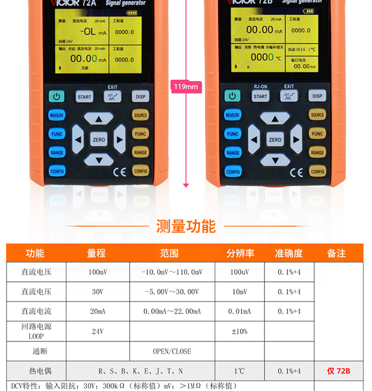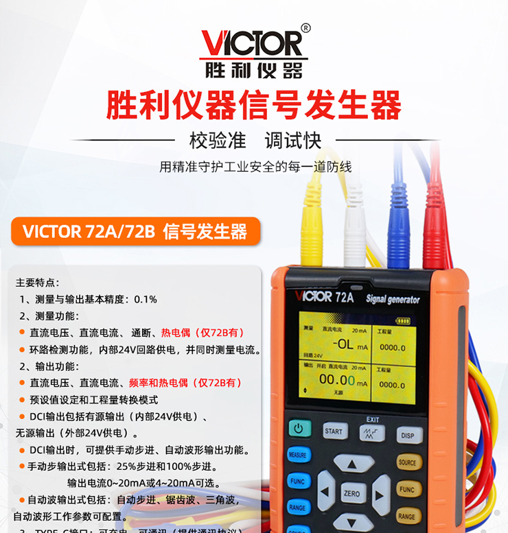 VICTOR 72A是一款鋰電池供電的便攜式掌上信號(hào)發(fā)生器,可用于測(cè)量直流電壓、直流電流、通斷,可模擬輸出直流電壓、直流電流。適用于現(xiàn)場(chǎng)變送器、DCS、PLC等系統(tǒng)的調(diào)試和校準(zhǔn)。VICTOR 72A在石油化工、生物制藥、工業(yè)自動(dòng)化、大專院校和科研機(jī)構(gòu)等領(lǐng)域的得到了廣泛的應(yīng)用,是工程師、技術(shù)工人及科研人員的“口袋級(jí)”實(shí)用工具。