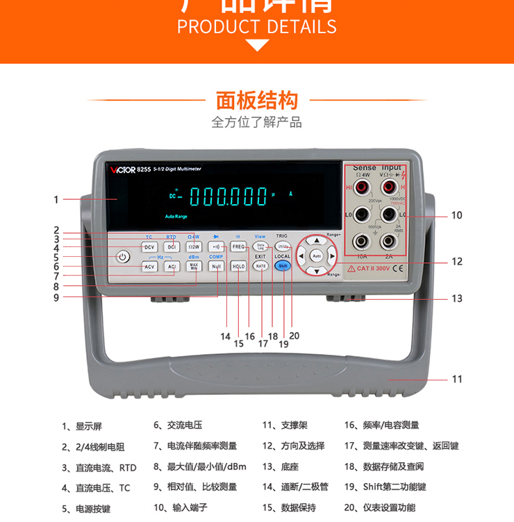直流電壓、交流電壓、直流電流、交流電流測(cè)量、電阻、電容測(cè)量、頻率測(cè)量通斷、二極管測(cè)試、熱電偶、熱電阻溫度測(cè)量、相對(duì)值測(cè)量(REL_%)、最大值、最小值、平均值測(cè)量(MAX/MIN/AVG)、測(cè)量比較功能(COMP)、測(cè)量值顯示保持(HOLD)功能